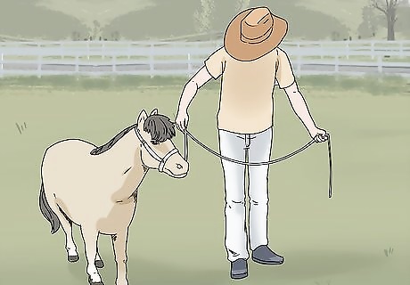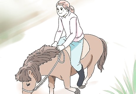 Let children weighing less than 50 lb (23 kg) ride your mini horse. Saddle your miniature horse, then place the child on its back. Use your line to guide the horse around the pen or pasture. Stay at the horse’s side to keep it safe. Don’t leave the child and horse unsupervised. Miniature horses can’t carry more than 50 lb (23 kg) on their back, so only very small children should ride them. Talk to your vet to verify the weight limits for your mini horse.