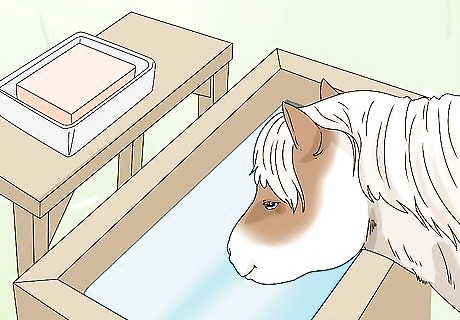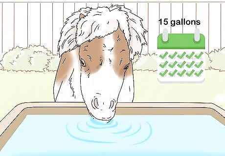 Give your horse at least 15 gallons (57 L) of fresh water daily. Give your horse water in clean buckets or a water trough. Replace the water at least twice a day to make sure it’s always fresh. When you give your horse water, check that the horse is drinking. It needs to drink at least 10 to 15 gallons (38 to 57 L) of water daily. Horses will not drink stale water, so refill it even if the water bucket still has water in it. If you’re using buckets, provide at least 2 in your horse’s stable or pen. When you replace your horse’s water, always empty out the old water. Then, rinse out the water bucket or trough before you refill it.