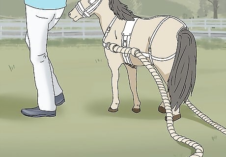 Attach heavy ropes to the harness to get your horse used to pulling. Tie or hook the ropes onto either side of the harness, and allow the rope to rest on the ground behind the horse. As the horse walks, it will be pulling the extra weight of the rope. Additionally, the rope will drag on the ground and mimic the drag of a cart. The rope will help your horse practice pulling a cart. It helps the horse gradually get used to added weight and drag.