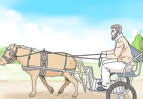Ride in the cart or walk beside the horse as it hauls items. Use the reins to guide your horse as it pulls the cart. Watch the horse while it works to make sure it isn’t being overworked. If you’re riding in the cart, hold the reins behind the horse. If you’re using the horse to haul items, walk beside the horse and hold the reins to the side.