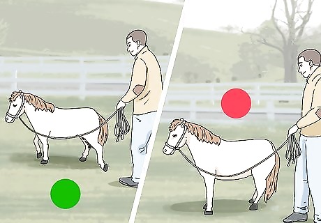Teach your horse to stop and go when you do. Stand at your horse’s side, holding its line in your hand. Then, begin walking forward and give your horse your walk command. Stop walking and make sure your horse follows suit. If it continues forward, step in front of it, hold up your hand, and say “Whoa.” Your walk command can be something like making “smooching” sounds or saying, “Giddy up!” This exercise trains the horse to follow your motion, which will help it respond better if you want to attach it to a cart and drive it. If your horse doesn’t start walking with you, gently tug on its line to encourage it to walk.
