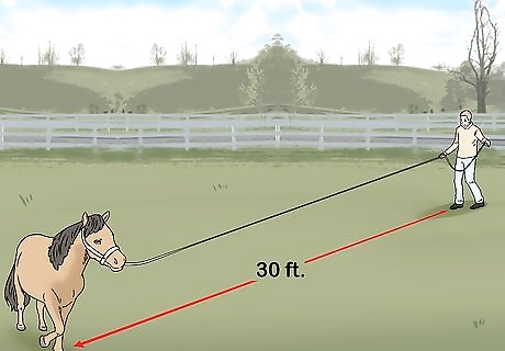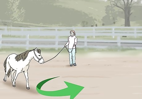 Longe (or lunge) your horse using a 30 to 40 ft (9.1 to 12.2 m) line. Fit a halter onto your horse, then attach the longe line to the lowest halter ring on the front of the horse. Make your horse move to the left by creating some slack in the line, then gently tugging it to the left. At the same time, hold up your right hand and wave it around to get your horse’s attention. After your horse moves to the left, switch hands and repeat for the right side. If waving doesn’t get your horse to move, you can smack your body to make a sound, which will get the horse’s attention. As an alternative, you can snap a whip in the air. However, never strike your horse.