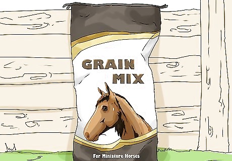 Supplement your horse’s diet with grain mix to maintain its weight and energy. Choose a grain mix that’s labeled for use with miniature horses or its weight range. Feed your miniature horse about 1 pound (0.45 kg) of grain a day, but divide it into two feedings. Always weigh the grain mix rather than measuring it out by volume. Check the label on your grain supplement to verify that you’re feeding your horse the correct amount. The recommended feeding amount can vary. If you give your horse too much grain mix, it will likely eat it, which can cause your horse to be overweight. Additionally, eating too much grain mix can make your horse gassy and uncomfortable.
