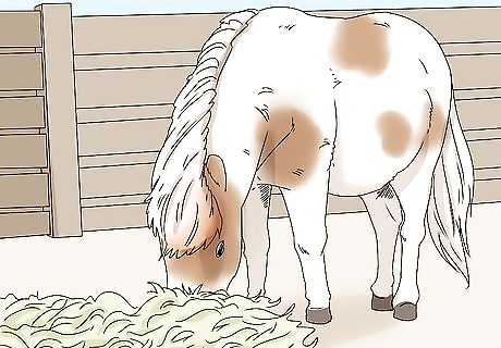 Give your horse 1-2% of its weight in hay for 50% of its diet. Choose green grass or alfalfa-grass mixed hay. Opt for soft, fresh hay rather than dry hay. Put the hay in a bucket or feeding trough, not on the ground. Don’t put your miniature horse’s hay on the ground, as it will end up eating dirt or sand, which can cause colic. You can estimate your horse’s weight using weight tape. Ask your vet for help, if you’re struggling to estimate its weight. However, it’s best to weigh the horse on a livestock scale. The average weight for a mini horse is 200 pounds, which means the horse should eat around 2 to 4 pounds of roughage each day.