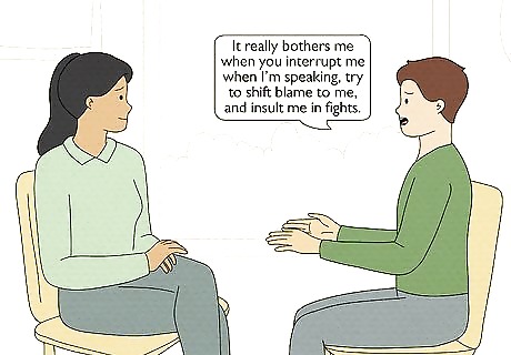 Keep your argument to three main points. You don’t want to bombard the person you are upset with with massive amounts of grievances. Instead, focus on a few key points that highlight why you were upset. If you overwhelm them, they’ll be less likely to respond positively and more likely to be defensive. For instance, if you feel upset with your partner after an argument, you might say something like “I wanted to talk about our fight. It really bothers me when you interrupt me when I’m speaking, try to shift blame to me, and insult me in fights. I don’t think it’s healthy and I’d like to proceed forward in a more constructive manner.”