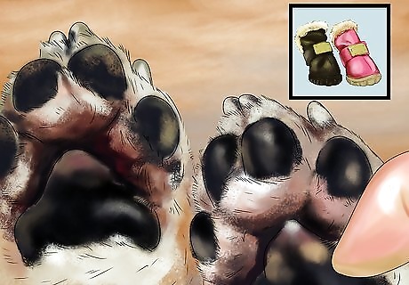 Check your dog’s paws for injury and deicers. Cold temperatures can lead to cracked or irritated paws, so check them daily during cold spells. Use a wet towel to wipe your dog’s paws and belly after each walk to remove salt or chemical deicers, then dry these areas off using another towel. Consider applying petroleum jelly or using booties to keep your dog’s paws free from irritation and help prevent salt or chemical buildup.
