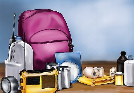 Make a storm or disaster kit. Prepare food and water for you and your pet for at least five days. Include your pet’s medications, proof of its vaccinations, and copies of medical records. Keep emergency numbers handy, such as your vet’s number and the contact information of an emergency animal clinic in your area or near where you’re staying during an evacuation. Be sure to pack a manual can opener if you include canned food in your emergency kit. Pack a portable pet first aid kit that includes gauze, saline solution, hydrogen peroxide, and pet bandages.