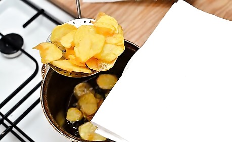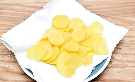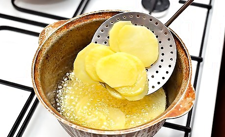 Submerge potato slices in heated oil, cooking until they appear white and matte. Remove the slices from the oil with a slotted spoon, and place them on a platter lined with paper towels. Do not crowd the potato slices. Cook them in multiple batches with each batch composed of a single layer at the surface of the oil.