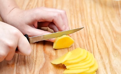 Slice potatoes as thinly as desired, placing slices in a large bowl of water to remove excess starch and prevent browning. A mandolin slicer can be used for a thin, even cut and added convenience.