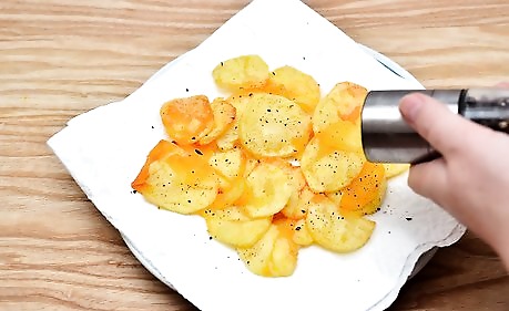 Transfer potato slices from the large bowl of water to a colander. Shake off excess water, and pat the potato slices dry with paper towels.
