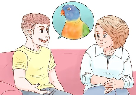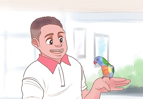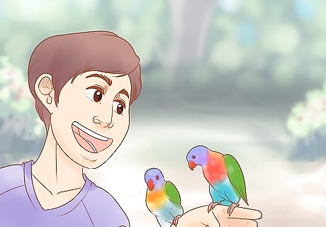 Foster a lory or lorikeet, if possible. Fostering will allow you to determine whether or not bird parenting is for you. Search for an exotic bird rescue in your area. Complete the necessary paperwork and agree to a background check, if necessary. Talk to the staff about how you'll need to prepare your home. Finally, honor any obligations you sign off on, such as returning the bird within a certain period of time if you choose not to adopt them. Lories and lorikeets are friendly birds. They like people and love to socialize, but it also means you need to have time to spend with them. Caring for a foster will help give you an idea of this commitment.