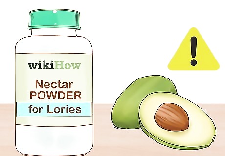 Familiarize yourself with the diets of lories and lorikeets. Unlike other psittacine species, lories and lorikeets thrive on flowers, pollen, and nectar. Make sure their diet is at least 75 to 80 percent nectar. Substitutes from your local pet store require regular mixing to prevent spoilage. You can also feed lories and lorikeets fruits and veggies like pitted apple cherries, dark leafy greens, and boiled potatoes. You also need to learn about foods that you must avoid. Avocados and chocolate, for instance, are toxic to exotic bird species. Pale greens, like celery and iceberg lettuce, lack the nutrient density that lories and lorikeets require.