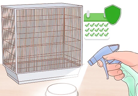 Prepare to clean every day. You can't train a bird to use a litter box. They poop where they please, whether they're in their cage or not. Bird droppings can carry dangerous bacteria and viruses that can be inhaled. Expect to clean inside and around the cage every day with non-toxic disinfectants like animal safe dish soaps. You'll also have to clean the water bowl, food bowl, toys, perch, etc.
