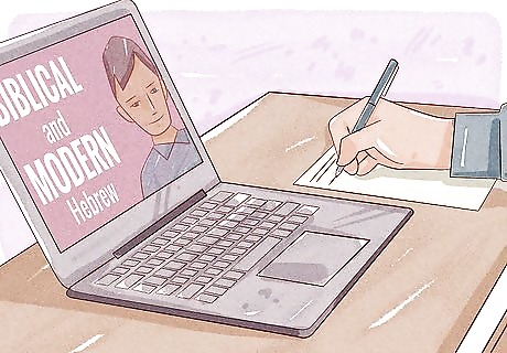 Sign up for online Hebrew language courses from your local university. One of the most efficient and best ways to learn the language is enrolling in professionally-taught courses. Many of these courses are sponsored by universities in Israel or foundations that sponsor the spread of the Hebrew language across the world. Online courses often require weekly participation and will provide you with personalized feedback from a skilled speaker of Hebrew. Some courses will have a fee associated with enrollment. Make sure you know what exactly your fee covers and what you'll be learning in the course. Many times, courses are organized by learning level and purpose for learning. For example, the Hebrew University of Israel offers courses on Biblical Hebrew, Yiddish, Modern Hebrew, and even Biblical Aramaic.