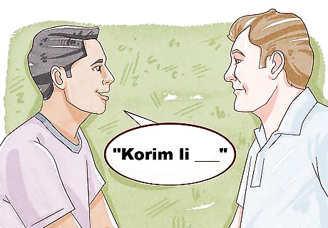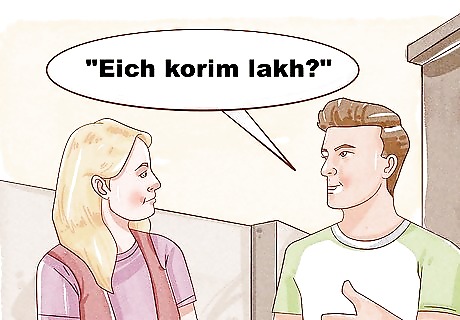 Practice asking questions to learn about new people. Making connections with people who speak the language is extremely important for learning Hebrew. When you make a new friend, ask them about themselves and share some information about yourself to forge a long-lasting friendship. To ask a man what his name is, you would say "Eich korim lekha?" and to ask a woman you would ask "Eich korim lakh?". To ask a woman where they're from, say "Eifo at garah?" and to ask a man, say "Eifo ata gar?" If you have a question about the language, you can ask "Eich omrim ___ beh'Ivrit?" which translates to "How do you say ___ in Hebrew?"