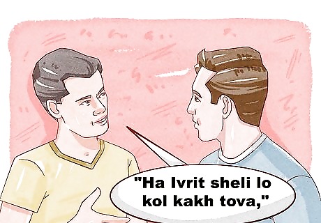 Practice using situational phrases. There are plenty of words that you say every day that you'll need to learn to communicate in Hebrew. Think about the situations that you might find yourself in if you travelled to Israel, and practice what you would say at those times! Let someone know that you're a beginner Hebrew speaker by saying "Ha Ivrit sheli lo kol kakh tova," which means "My Hebrew isn't very good." Like most other cultures, people who speak Hebrew are very respectful. To say "Please" and "You're welcome" in Hebrew, you say "Bevakasha." To say "Thank you," you say "Todah" or "Todah rabah" to express your gratitude. To ask friends how they're doing, say "Ma nishma?", which translates to "What's up?" in English. To ask a stranger or someone who you respect how they're doing, say "Ma shlomech?" to women, and "Ma shlomcha?" to men. If someone asks you how you are, you can reply with "Tov" or "Tova" which means good, "Sebaba" which means awesome, or "Beseder" which means fine.