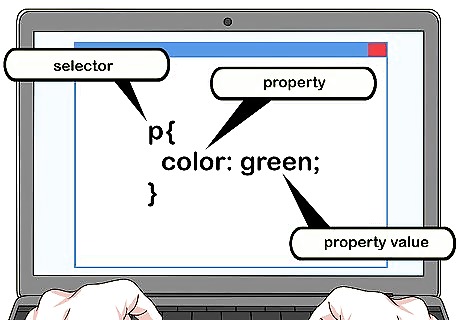 tags. For example:Get familiar with the elements of a CSS rule set. An individual piece of CSS code is called a “rule set.” The rule set contains the different elements that define what you want your code to do. These include: The selector, which defines the HTML element you want to style. For example, if you want your rule set to affect paragraph elements, you would start your ruleset with the letter “p”. The declaration, which defines the properties you would like to style (such as font color). The declaration is contained within curly brackets {}. The property, which specifies which property of the HTML element you want to style. For example, within the