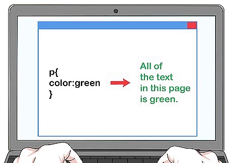 Use CSS to apply styles to your HTML documents. CSS is a stylesheet language that allows you to apply different style and design elements to your webpage. For example, if you want to selectively apply a specific font or text color to some of the text elements on your page, you can create a CSS file to do that. Then, you can insert the CSS file into your HTML document wherever you like. For example, if you wanted a CSS file to turn all the paragraph elements in your HTML document green, you could create a .css file containing the lines: p { color: green; } You would then save the file with a name like style.css. To apply the stylesheet to your HTML document, you would insert it as an empty link element within the