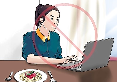 Remove distractions. In addition to trying to slow yourself down, remove distractions from your surroundings when you're eating. It can help you concentrate and focus on how fast you're eating and your meal. Like eating slowly, studies have shown that when you're distracted you may end up eating more and this could cause weight gain long-term. Try to take 20 – 30 minutes to eat your meal free from distractions. Turn off cell phones, close laptops, and computers and turn off the TV.