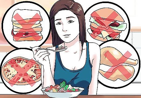 Limit high fat, high sugar and high calories foods. Even small portions of higher calorie foods (like fast food or sweets), most likely will not promote weight loss. These foods pack on calories without really keeping you full. Remember that you're better off eating foods that are nutrient-dense, not calorie-dense. You do not need to completely avoid these types of foods — especially if they're some of your favorites — but limit them to help lower your overall calorie content. Watch out for high-fat foods like: fried foods, fast food, fatty cuts of meat and processed meats. Also watch for higher calorie foods with added sugars like: sweetened beverages, candy, cookies, pastries, ice cream and other desserts.