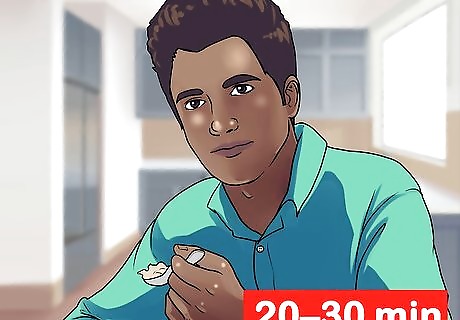 Take 20 – 30 minutes to eat your meal. Studies have shown that taking at least 20 – 30 minutes to eat your meal may help you eat less. Hormones secreted from your gut have time to reach your brain and signal satiation or satiety. If you're a faster eater, you'll most likely benefit from taking some extra time with your meals. You may notice, that the slower you eat, the more satisfied you are. Put your fork down between each bite. This can help force you to slow down and take your time when you're eating. Talk to friends or family members while you eat. Instead of focusing on eating your food, talk to family and friends and engage in conversation to help slow you down.