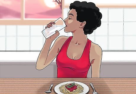 Drink water while you eat. Drinking while you're eating can have a variety of positive benefits for your eating time and waistline. If you're putting your fork down in between bites to help slow yourself down, take a sip of water. The more you sip on water throughout your meal, the more full you will feel off of a no-calorie liquid. In addition, the more you drink with each meal, the more water you consume overall throughout the day. This can help you reach your daily goal of eight to 13 glasses of water.