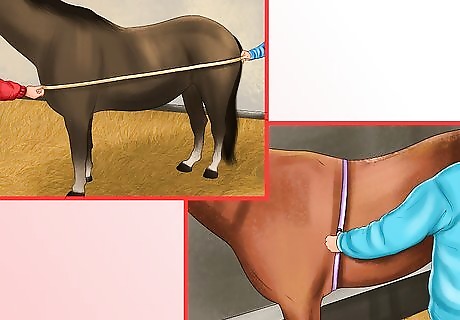 Estimate your horse’s weight. If you don’t have access to a set of scales, or if you want to calculate your horse’s weight in-between weighing, you can also use an equation that calculates the horse’s weight based on their body measurements. If you are using the metric system, your measurements should be done in centimeters. If you are using the imperial system you should take the measurements in inches. To do this, take your horse’s heart girth measurement just behind the horse’s elbow. Lay the tape so it is about an inch behind the top of the withers and pass it underneath the horse so that it lines up just behind the elbow. You will also need to measure your horse’s length by starting at the tip of the shoulder (just below the neck) and ending at the tip of the buttock. If you feel the horse’s buttock carefully, you will feel a bony point. This is where the tape measure should stop. Use this equation to get your horse’s weight in kilograms: Weight (kg)=(heart girth in cm * heart girth in cm * body length)/11,990. For example, if your horse’s heart girth is 195 cm and it’s length is 183 cm, the equation would look like this: (195*195*183)/11,990 = 580. Thus, your horse’s estimated weight is 580 kilograms. If you want your horse’s weight in pounds, use this equation: Weight (lbs)=(heart girth in inches * heart girth in inches* body length)/330. For example, if your horse’s heart girth is 77 inches and it’s length is 71 inches, the equation would look like this: (77*77*71)/330 = 1,276. Thus, the estimated weight of your horse is 1,276 pounds. You can also use a weight tape that measures the weight of your horse based on their heart girth. When you wrap this tape around the horse’s body at the heart girth, you will find the weight printed directly on the tape.