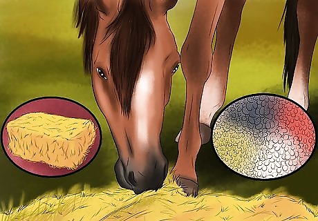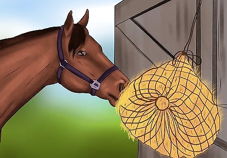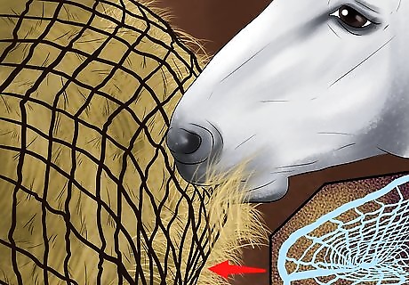 Help your horse eat slower. One way to help your horse lose weight is to help them eat slower. If your horse eats slower, it will likely eat less. One way to do this is by double-bagging hay nets. This will make it more difficult for your horse to get the hay, forcing it to eat slower. You can also feed your horse more frequently, but in smaller portions. This will help keep your horse from overeating. Feeding your horse slower will also keep it occupied. This will help keep the horse from getting bored and developing bad habits.