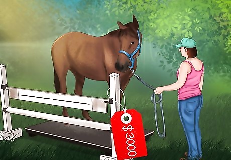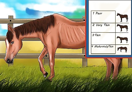 Determine your horse’s condition. Though it is good to know your horse’s weight, it won’t necessarily give you an indication of whether your horse is too fat or too thin. To determine this, you need to look at your horse’s “condition.” There are several ways that this can be done, but the most common system is known as the “Henneke Body Conditioning Score” or “BCS.” This scoring system uses a 1 to 9 system where a 1 refers to a horse that is extremely emaciated and 9 refers to a horse that is extremely obese. A horse that is a 5 would be considered to be in good condition. To use this system examine the amount of fat present on the loins and tailhead, ribs, elbow, shoulder, withers, and neck area. In each area, a horse that is in good condition will not have visible bones, but these bones can be easily felt when you touch them. For example, on a well-conditioned horse, you shouldn’t be able to see the ribs, but you should be able to feel them easily if you run your hand along the ribcage.