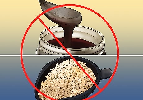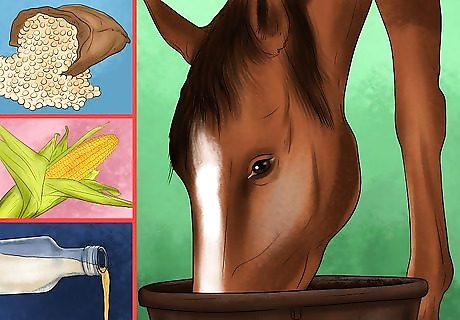 Reduce the amount of grain in your horse's diet. If your horse is overweight, the first step is to reduce or remove grain from your horse’s diet. A horse that is not very active can often do well on good quality forage alone. If you do want to feed grain to your horse, try to avoid grains containing corn, molasses, or high starch levels, and opt for grains with less than 3.5% fat.