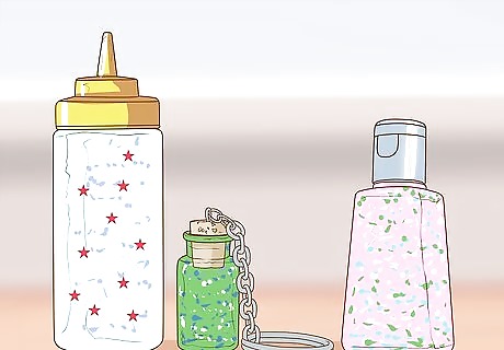 Try out different containers until you find a size and shape you like. In addition to ordinary jars and bottles, look for other items that might make good calm down jar. If it’s made of transparent plastic, an empty sunscreen or condiment bottle can be cleaned out and turned into a perfect travel-sized calm down jar. You could also make an oversized version using a repurposed peanut or pickle jar that all the little ones can gather around at once. Make sure the container you select is clear, can be gripped easily, and won’t shatter if it’s dropped or thrown. Fill a keychain-sized hand sanitizer bottle with glitter to give your kids something to play with while you’re grocery shopping.