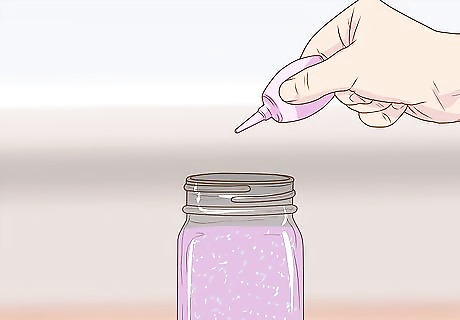 Add a few drops of food coloring. Swish the jar gently to help the food coloring diffuse throughout the water-glue mixture. The amount you use is largely up to you. Less food coloring will give the jar a bright, translucent look, whereas denser color will produce a mesmerizing galactic swirl. Stir in the food coloring gradually until you reach the desired shade. Be careful not to add too much color. This will darken the contents of the jar and make it difficult to see the glitter. Just use 3 or 4 drops for mason jars, but only a tiny, tiny drop for sanitizer bottles. If you add too much, pour out most of the bottle and add more water.
