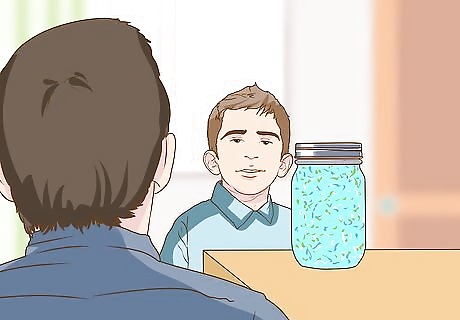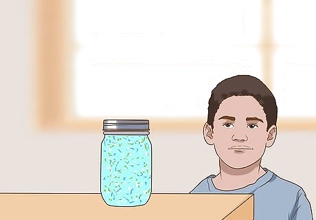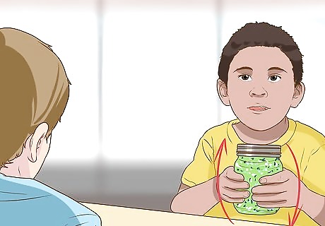 Have your child hold the jar in both hands and shake it. Vigorously shaking the jar will give your child a physical outlet to blow off steam while they’re still worked up. They can jostle it as hard as they want for as long as they want until their frustration begins to subside. When shaken, the liquid inside the jar will shift, causing the glitter to dance in a brilliant cascade. Demonstrate how the jar works and explain that it’s supposed to make you feel better when you’re unhappy. Make sure small children can safely hold and shake the jar themselves. If not, you can get it started for them.