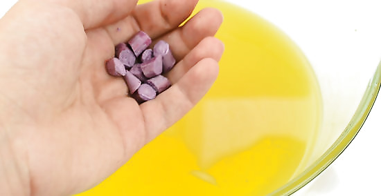 Color the wax. Stir the wax every so often as it melts. As it’s continuing to melt, chop your dye block or chips into small chunks (if you’re using them). Consult the manufacturer’s instructions regarding how much to use based on the amount and type of wax you’re using. Once all the wax has fully melted and it’s become a clear liquid, remove it from the heat. Add in the dye and stir until the dye has melted and been dispersed evenly throughout the wax.