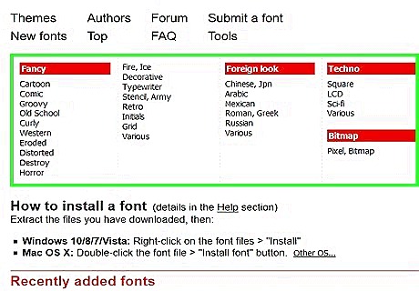 Select a font category. On most font websites, you'll see a menu pane (either at the top of, or on the right side of, the screen) listing different font categories (Ex: Serif, Old School, Groovy, etc.). Click on the one you want as they style for your thumbnail title/caption.