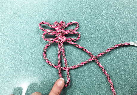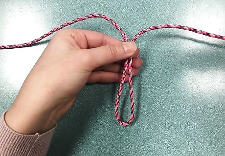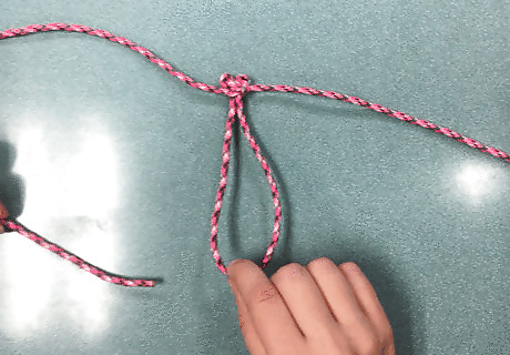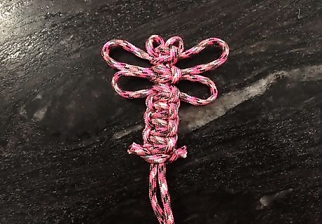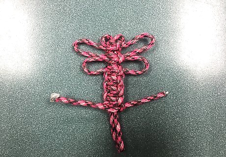 Create a 4 inch loop. Make sure the loop is centered in the middle of the strand of paracord. Begin by folding the 4 foot strand in half and placing your fingers 4 inches from the end of the fold. For inexperienced users, try starting with a 5-6 inch loop instead to make knotting easier. This loop is the "body" of the dragonfly Troubleshooting: Make sure the two free ends are separated (one to the left, one to the right), as seen in the picture above.