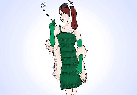 Add other accessories. Though it's certainly not mandatory, a long string of pearls or feather boa is a fun addition to your already playful outfit. Gloves and a long cigarette holder can help put you in the flapper zone, too! Don't forget your makeup! Depending on the color of your dress, you may be able to pull off bright red lipstick -- don't be shy! You'll be turning heads already, might as well milk it for all it's worth!