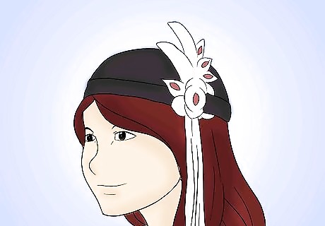 Make a headband. Buy a length of sequin. It should be a matching color to your tunic or fringe. Measure it around your head -- because it stretches a little, it's best to make it a bit smaller rather than a bit bigger. Cut off the desired length and adhere together with E6000 glue. Pick the desired place on the headband for your embellishment. This could be a flower, feathers, jewels, or whatever suits your fancy. Place some craft glue on your adornment and press firmly into place. You may want to pin it together with clothespins and leave to dry.
