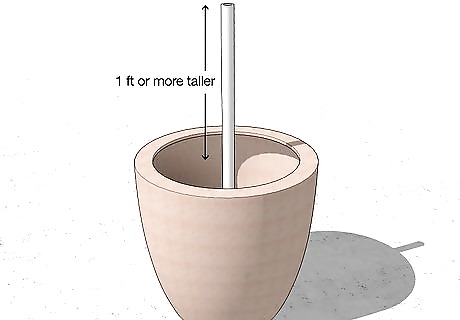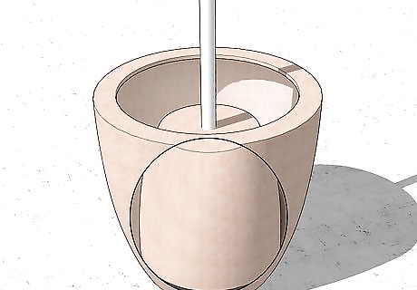 Build your base. Get a 5 gallon (18.9 L) cylindrical bucket and cut a hole for a 3/4 PVC pipe at the bottom. Turn the bucket upside down and fit a piece of 24" PVC pipe through the hole, leaving about 6" of space at the bottom. Use silicon or caulk to seal any gaps. Place this structure on a large piece of spare plywood, and then center a 12" wide piece of concrete forming tube around the bucket. This is your form for the base and will be filled with quick-set concrete. Fill it until the bucket has at least 2" of material covering it and then give it a shake to remove bubbles. Let it set according to the manufacturer's instructions.