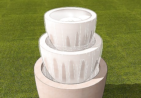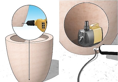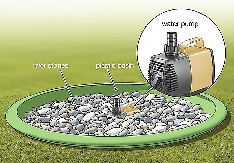 Create the basin. Dig a shallow hole big enough to get a plastic garden basin in. Fill it part way with river stones set a 100–155 gallon (586.7 L)-per-hour pump into the rocks and then cover the pump with a layer of rocks.