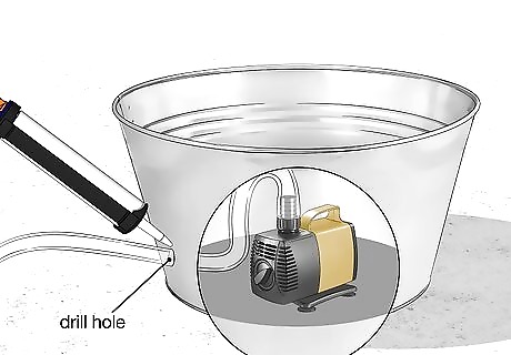 Create the base. Puncture a 1/2" hole in the side of the metal tub and insert the tubing through it. Attach the tubing to the pump and then seal off the hole with Sugru and/or silicon so that it is watertight. This punctured hole should be very close to the bottom of the tub.