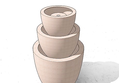 Continue placing pots. Place another large pot, using the upside down one as a base. You will also need to drill a tubing hole in this pot. Continue placing pots in this manner until it looks like you have 3 nested pots. Don't forget about the hole for the tubing and the notches on the rim of the 2 upside down pots.