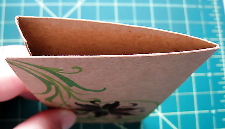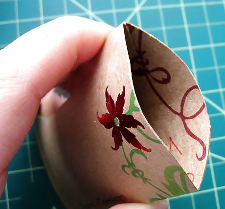 Using the same object, score curves at each end. Score on both sides. Do not draw or cut these curves. Line the round object up so that it just meets each corner of the tube.Cut all the layers of the card along the curves you just traced.