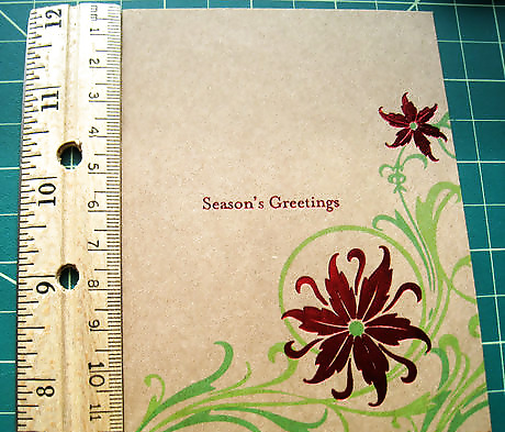 Measure the height of the card. Mark where you will score and fold it. One fold will create a short tab about 1/2" (1cm) long and the other fold will divide the remaining section into two equal parts. You can put the short tab either on the top or the bottom, so take a look at the design on the card and decide how you'd like it to line up on the finished pouch.