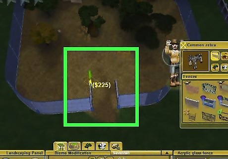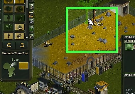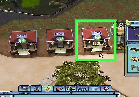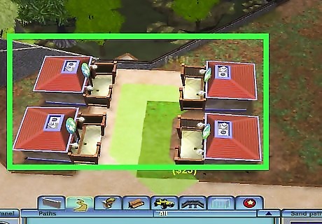 Make a food court. Select dirt path, and make several longer rows of it, making a good sized square of land dirt. Put a drink stand, a food stand (sea dog or hot dog are the best for the beginning of your zoo) a few picnic tables, a few restrooms and a few trash cans.