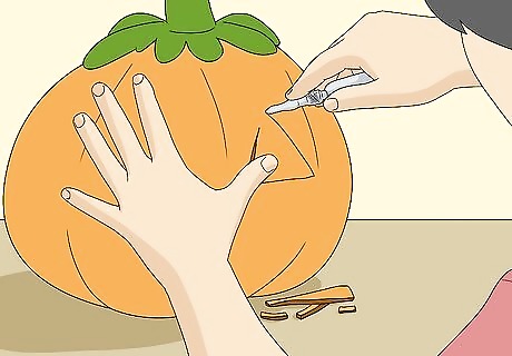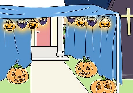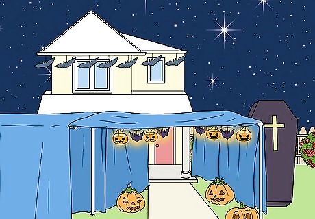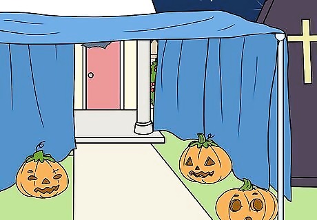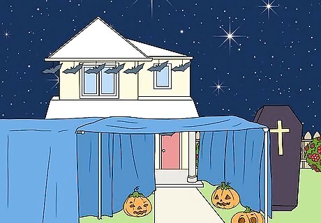 Make or purchase the props. There are a number of things you can make yourself at home, or you can purchase items at stores specializing in Halloween decorations. Some ideas of things to make include: Gravestones: Get some gray cardboard, and cut them into the shape of grave stones. Write some "cutesy" names on it, such as Frank N. Stein, Zom B., Jack O. Lantern, or I. M. Dead, etc. Spider webs: Take rolls of toilet paper, and "string" them along the branches on the trees outside of your house, in the shape of spider webs. An alternative to toilet paper is cotton wool. Ghosts: Take white kitchen garbage bags, and fill with old newspapers. Tie up, and then, with a black marker, draw two eyes and a mouth on each of them, to make little ghosts. Jack-o-lanterns: When raking up leaves, purchase orange biodegradable leaf bags which look like jack-o-lanterns, and leave on the lawn for the big night.