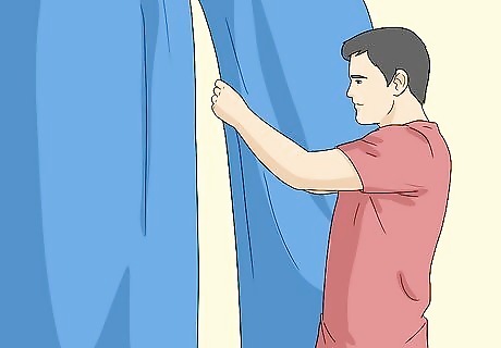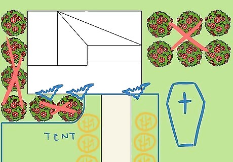 Set up the "walls" of the house. If you're using a tent or marquee, put it up according the instructions. If you're using sheets, black plastic, or tarpaulins, you'll need to find items to hang them from (such as sturdy tree branches or fences) or place bamboo or similar posts into the ground to secure them to. Tape and rope on firmly to prevent falling during the evening. Make sure that the entrance way to the house is clear of clutter, garden beds, fragile plants, etc. that you don't want people to accidentally tread on. Also try to close off any sides that might encourage people to wander off into the rest of your garden and become lost. Use simple props like chairs, cardboard signs, etc., to direct people away and back into the haunted house.