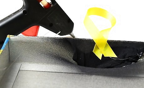 Fold the ends of the nylons to the back of the lid, and secure them with hot glue. You don't have to worry about being too neat; this will be the back of your earring holder, and invisible once you hang it.