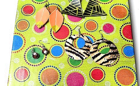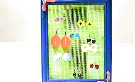 Wait for the glue to dry, then hang your earring holder. You can now stick earrings into the mesh. This works well with hook and post earrings. When attaching post earrings, you will need to take the back off the earring first, push the earring through the mesh, then put the back on again.