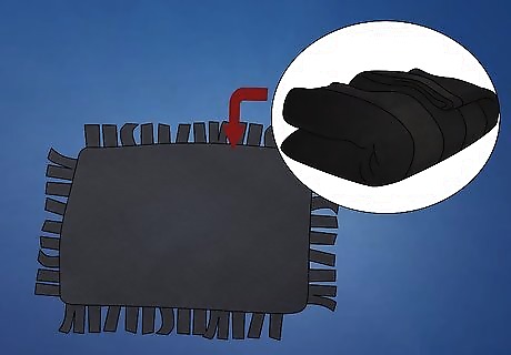 Gather your fleece. The first thing you'll want to do when making a no-sew pet bed is create your covering. To start, you'll need at least two pieces of fleece. You can repurpose an old fleece blanket or purchase fleece at a local craft store. The amount of fleece depends on the size of the bed you're creating. You want to make sure the fleece is big enough for your dog or cat to sleep on comfortably. You have the option of stuffing your bed with an old pillow or using old clothing or scraps of fabric as stuffing. If you're using a pillow, make sure the fleece is big enough to cover the pillow. You should also take into the account the size of your pet. A comfortable pet bed should be big enough for your pet to lie down and stretch out in the bed. It may be a good idea to measure your pet when she's stretched out somewhere. Measure the length and height of your pet when she's stretched out, and aim to have your bed a little bigger than that. For example, if your cat is about a foot long and six inches high when stretched out, you could make a bed that's 15 by 10 inches. You will be slicing the sides of the fleece into strips and tying them together instead of sewing. Therefore, consider the dimensions you want for your finished bed. Get 4 to 6 more inches of fleece than these dimensions. For example, if you want a bed that's 3 feet by 2 feet, get a block of fleece that measures 3'4" by 2'4".